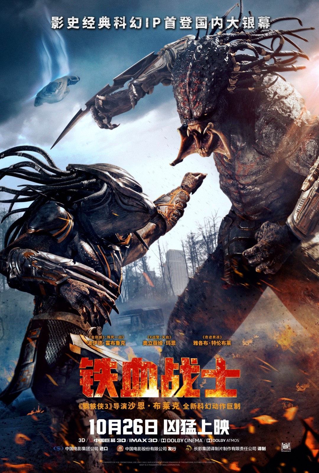 倒计时4天!《铁血战士》即将亮相中国内地大银幕!由二十世纪福斯出品、《钢铁侠3》导演沙恩·布莱克执导的好莱坞科幻动作冒险大片《铁血战士》将于10月26日凶猛上映,这也是铁血战士历史上首次登陆内地影院。影片目前已在各大平台开启预售,在上周的全国21城超前粉丝场中也获得了不错的口碑,粉丝称之“高于预期,比想象中好看”,更有粉丝称赞“终于迎来一场止渴的电影,紧张刺激的对决镜头根本挪不开眼,完全是强制催生肾上腺素,过瘾!”。作为“好莱坞保护季”的头部动作大片,《铁血战士》率先带影迷进入年末狂欢。